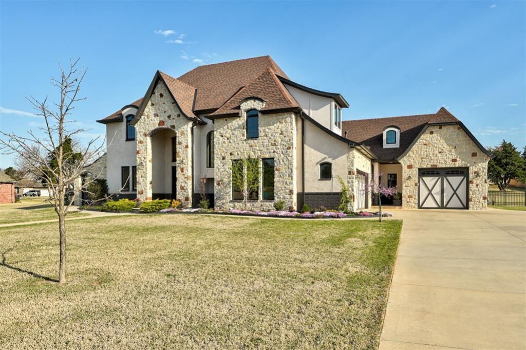 WOW! Acre lot + serious upgrades + a backyard setup you don't see every day-this one stands out immediately. Loaded with upgrades, on a full acre, with 4 beds including hard-to-find 2 downstairs en-suite bedrooms, PLUS an office, a covered patio with outdoor kitchen and wood-burning fireplace, and an upgraded kitchen to absolutely die for! This was going to be their forever home, so they went all out. Their loss is your gain! Step inside to a grand two-story foyer with a custom chandelier and custom iron stair railing. The chef's kitchen features a stunning, one-of-a-kind granite, gas cooktop, double ovens, ceiling-height cabinetry, glass upper cabinets with lighting, under-cabinet lighting, and a built-in coffee bar centered around a large island and big pantry. Wood-look tile runs throughout the main living areas downstairs. The living room looks to the picturesque backyard and has a floor-to-ceiling stone fireplace. The office has its own private patio. Lush, mature landscaping with roses, peonies, flowering peach, creeping phlox, and perennials that come back and bloom year after year-you'll fall in love the moment you pull up. Upstairs has a huge bonus room and a pre-wired media room-perfect for a playroom, workout space, second office, teen retreat, etc. (Plus approx. 400 sq ft upstairs plumbed to expand-add a bedroom, bath, or whatever fits your needs.) Step outside to your covered patio with outdoor kitchen and wood-burning fireplace, a full acre with sprinkler system, custom iron front door and matching gate, audio system throughout including living areas, media room, and both outdoor spaces, Generac generator, in-ground storm shelter, hardwired security system, and electrical in place for a future pool. Located in highly sought-after Mustang Public Schools (consistently rated 8-9/10 on GreatSchools) and just minutes to the turnpike, I-40, Will Rogers Airport, and downtown OKC. Homes like this don't come up often-schedule your showing before it's gone.